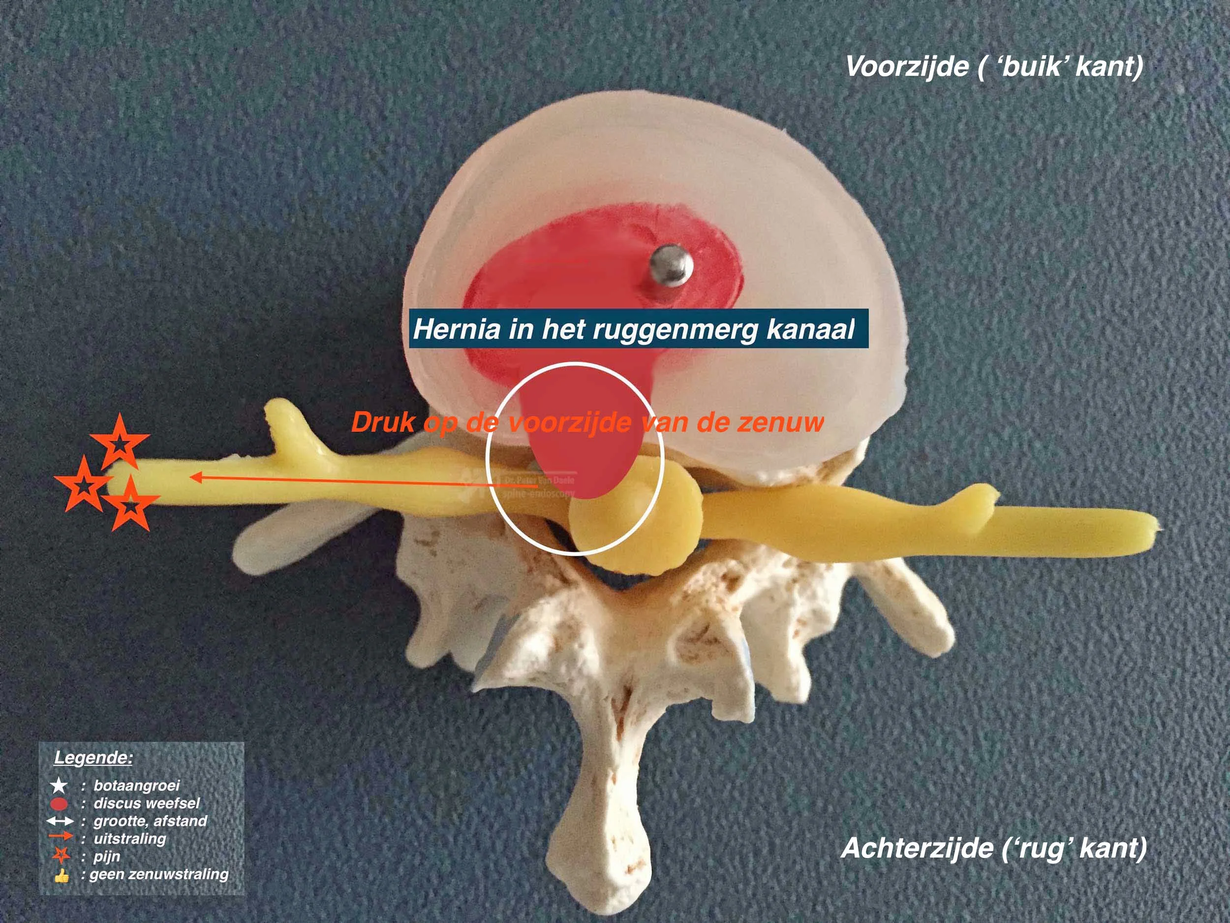 The severity of the symptoms depends on how much pressure the cyst causes on the nerve. In addition to leg pain, reduced strength in the leg and sensory disturbances such as tingling, burning or deafness can also be caused by a hernia. With very large cysts the radiation can be present in both legs with sometimes walking disorders and in extreme cases there can be loss of urine or bowel control.